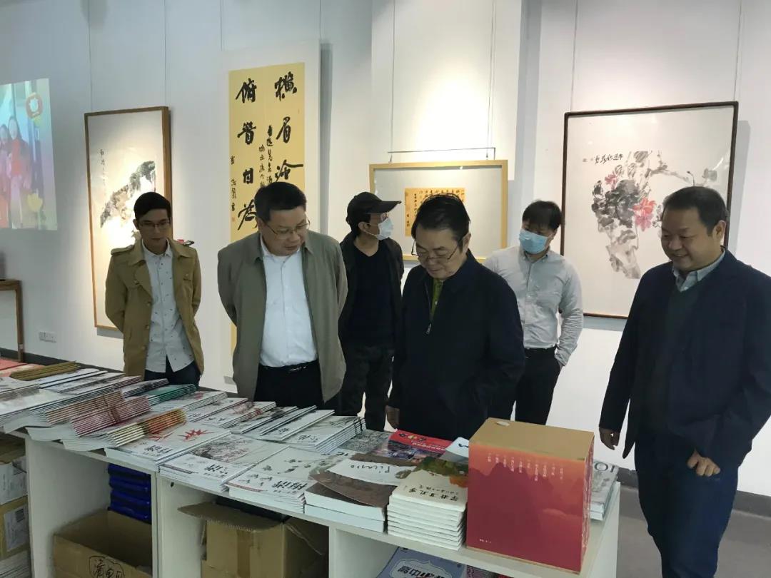 ▲廣西出版?zhèn)髅郊瘓F總編輯張藝兵(左二),廣西政協(xié)原副主席、中國美協(xié)原副主席黃格勝(右三),廣西美術出版社社長陳明(右一)一同參觀展覽