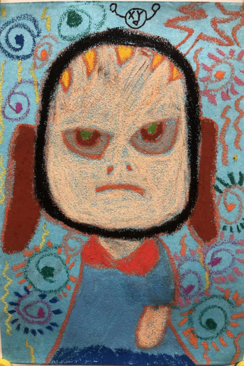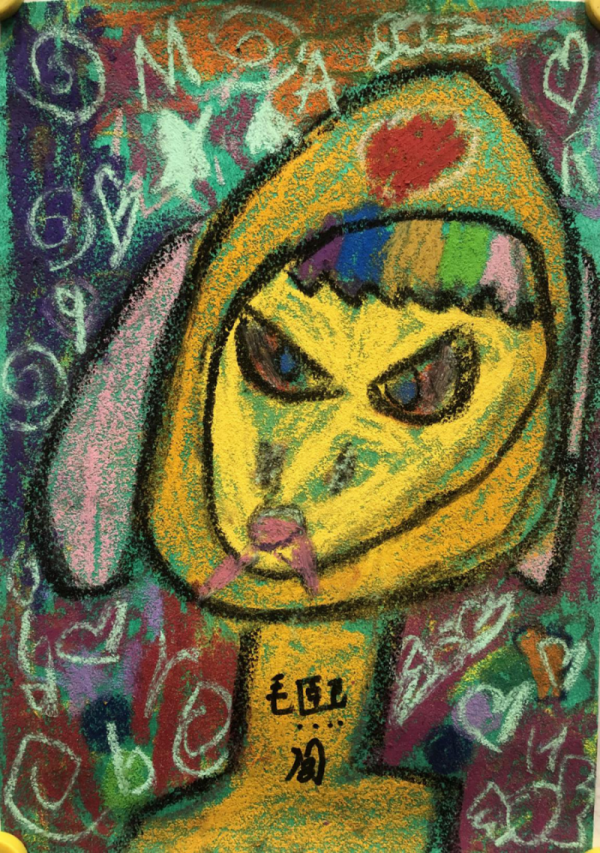 毛熙月(女)這幅畫借鑒了奈良美智的名作《寂寞的小狗》。畫中“似狗非狗”的形象給人一種另類的感受,小朋友使用了大量橘黃色描繪主體形象,加大直觀的沖擊力。這種看似格格不入的色調(diào)與裝扮,加上背景各種顏色的拼接和符號(hào)的添加,有種特立獨(dú)行的意味。