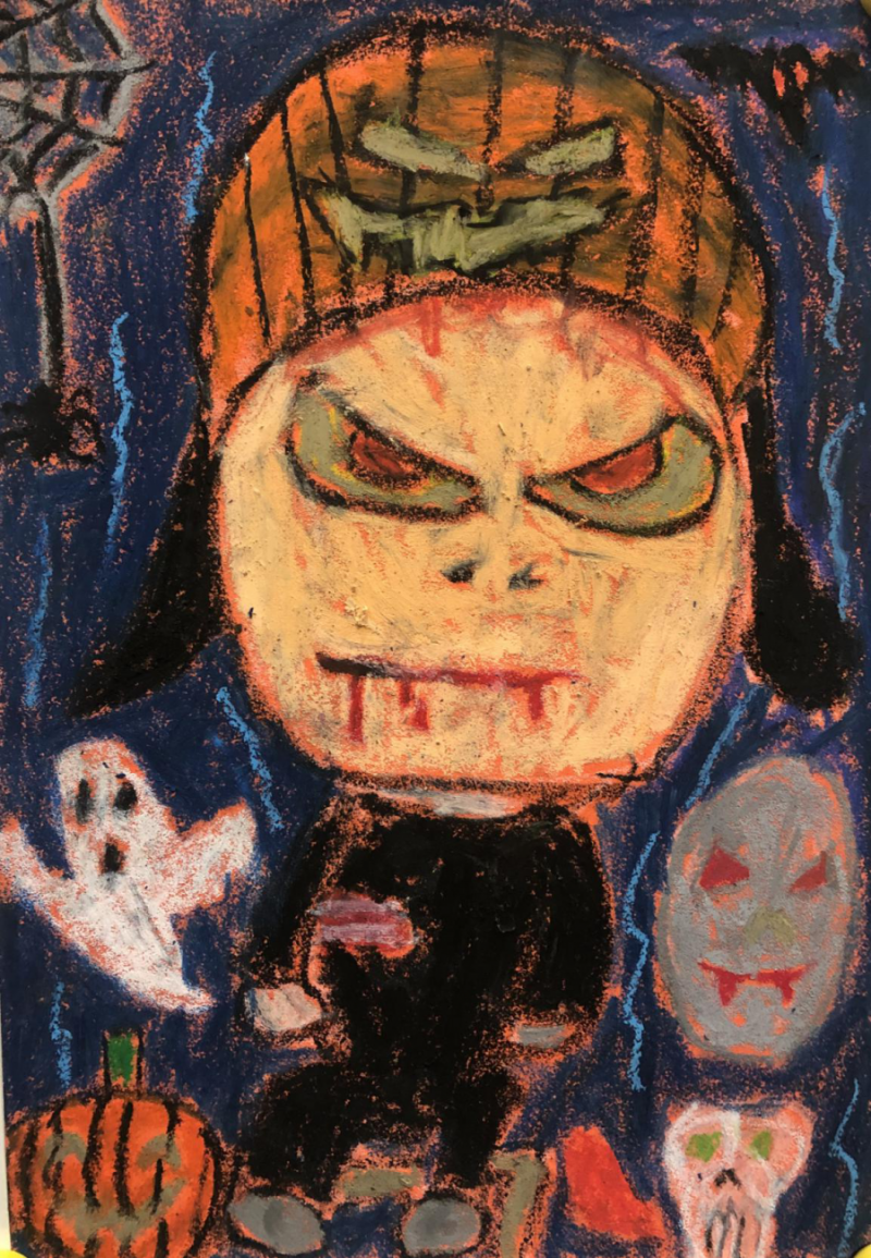 丘翊辰(男)小朋友這幅畫描繪了充滿搞怪的萬(wàn)圣節(jié),我仿佛看到鄰居家的熊孩子跑來(lái)敲門向我要糖果的樣子。小畫家顏色搭配得非常好,畫面用深藍(lán)色來(lái)表現(xiàn)萬(wàn)圣節(jié)的背景。幽靈的白色,南瓜的橘黃,鬼怪的灰色,蝙蝠、蜘蛛和衣服的黑色,全部混合搭配在一起又不會(huì)顯得色調(diào)沉重,萬(wàn)圣節(jié)的各種元素搭配使用非常到位。一些零碎的點(diǎn)線面的裝飾,與背景色融合恰當(dāng)。大臉娃娃的可怕表情和眼神,讓我有種不寒而栗的感覺,像是在說(shuō):“不給糖就搗蛋!”